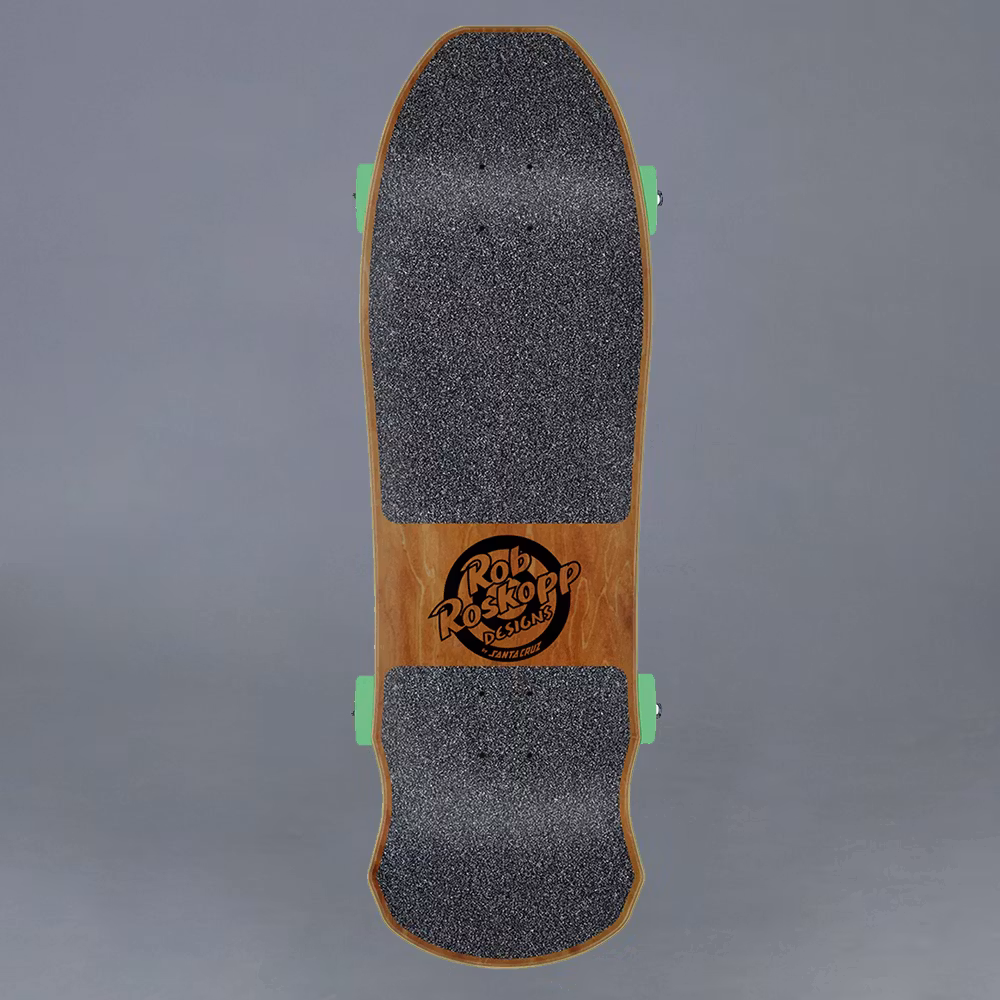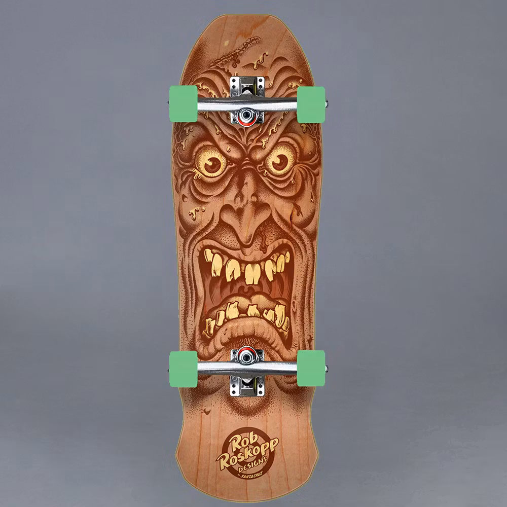 Santa Cruz Skateboards Roskopp Face cruiser featuring transparent inks on natural veneer with Independent Stage 4 polished trucks, 55mm, 78a OJ Mini Super Juice wheels, Independent Genuine Parts risers, durable steel bearings, and laser cut griptape.