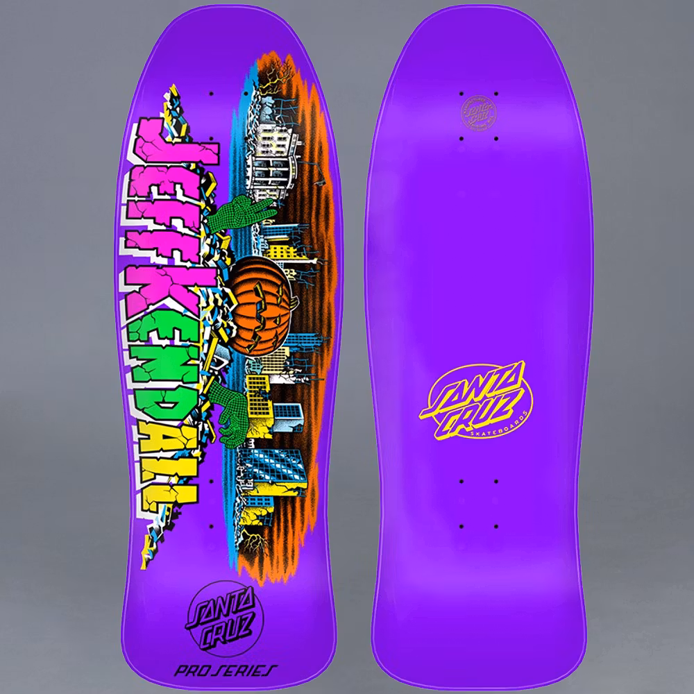 The Santa Cruz Skateboards Kendall Pumpkin Reissue deck features iconic Jeff Kendall Pumpkin artwork by Jim Phillips on a fully dipped matte purple deck, Jeff Kendall's classic Pumpkin reissue shape with a 15.125in wheelbase and Cruz Missile II Concave.