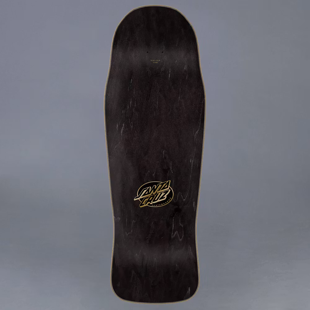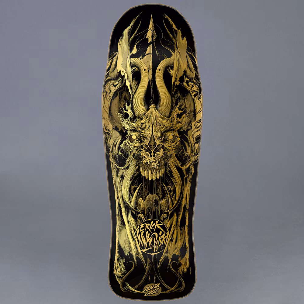 Santa Cruz Skateboards Erick Winkowski Primeval Pro Shaped deck featuring spot gloss and metallic graphics on gold foil with artwork by Ken Taylor on Erick's OG shape.